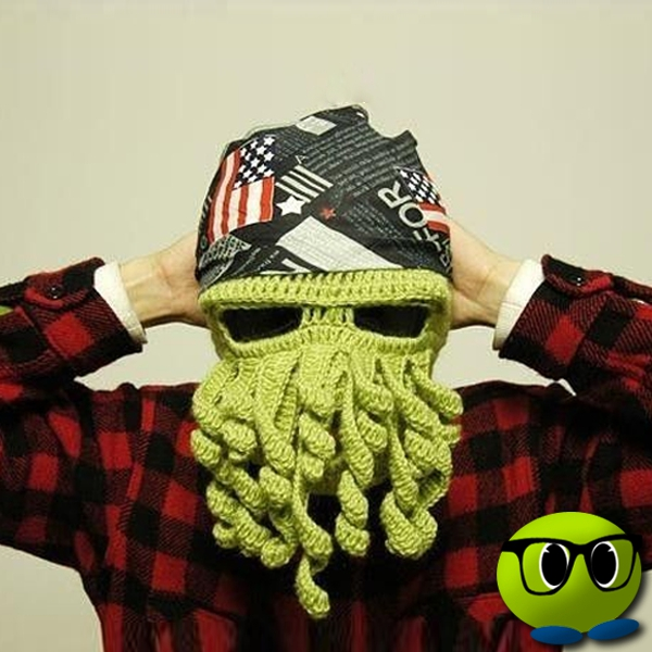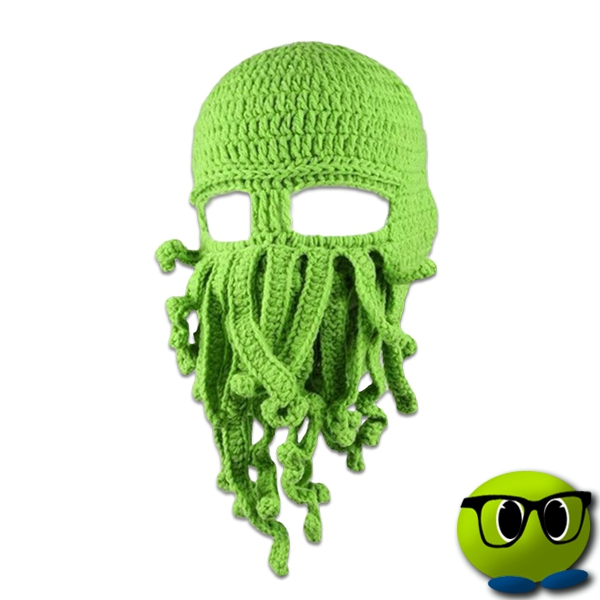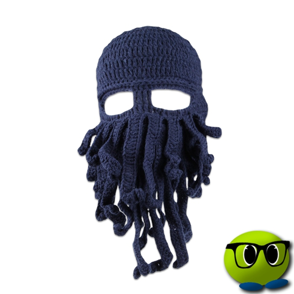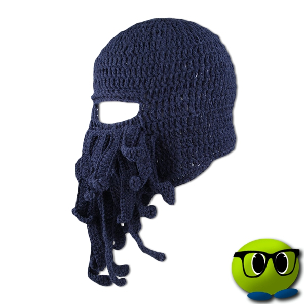 La cagoule est fabriquée en laine douce et est dotée de tentacules comme la pieuvre. Elle est disponible en vert ou en bleu foncé.