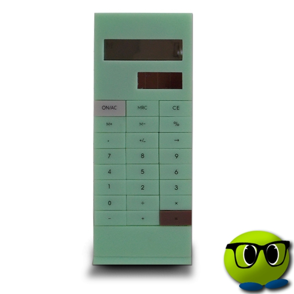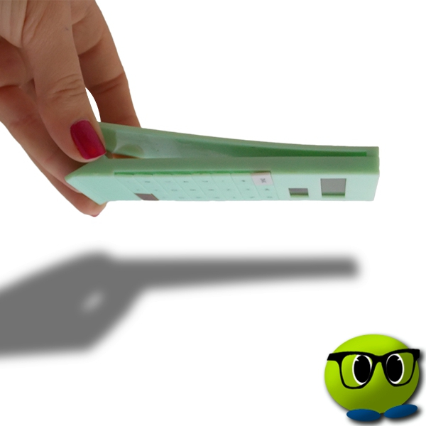 Elle possède une double fonction : faire tout simplement des calculs et, avec la pince, accrocher des documents. Cette calculette en plastique se recharge à l’aide de l’énergie solaire grâce à un capteur solaire.