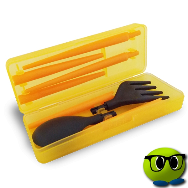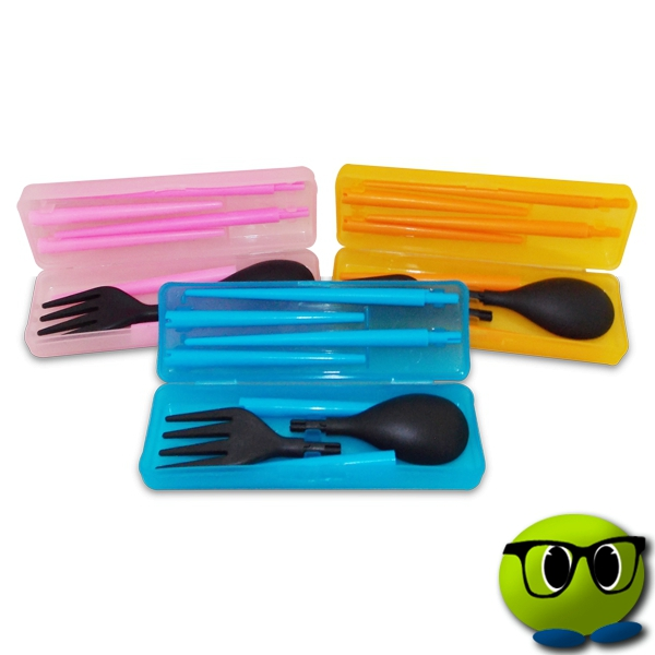 Le kit comprend une paire de baguettes, une cuillère et une fourchette. Ils sont fournis dans un trousseau en plastique de couleur jaune.