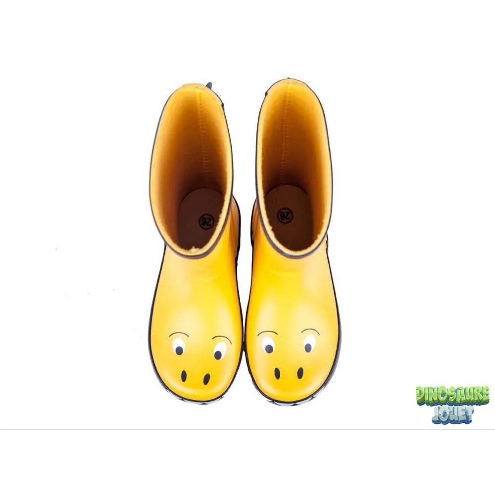 Bottes de pluie jaunes et vertes dessin 3D dinosaure.