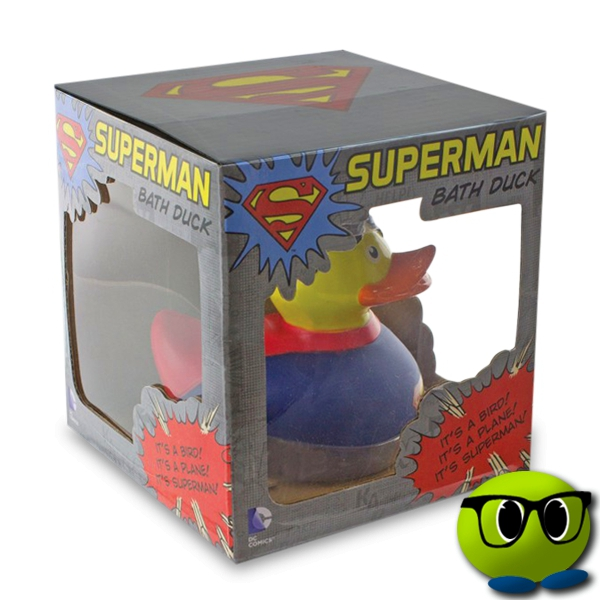 Il s’agit d’un petit canard de bain qui se déguise en Superman. Il porte le costume du super-héros avec le logo S affiché sur son torse. Même ses cheveux sont comme ceux du personnage.