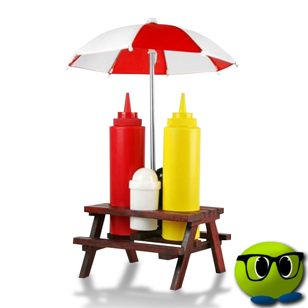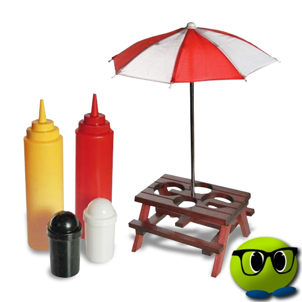 Le design soigné de ce set de condiments en forme de table de pique-nique offrira une jolie décoration à votre table. Equipé d’un mini-parasol rouge et blanc, cet accessoire est composé d’une bouteille pour moutarde ou mayonnaise, d’une bouteille pour ketchup, d’une salière et d’une poivrière.