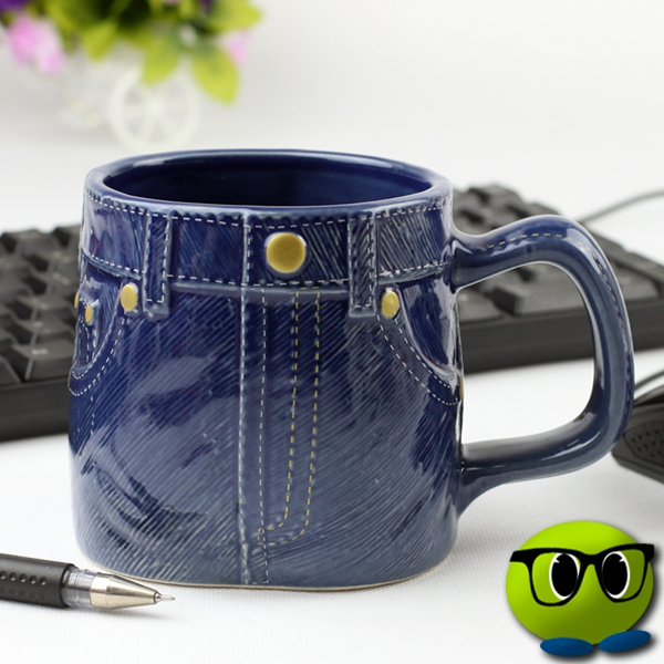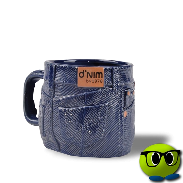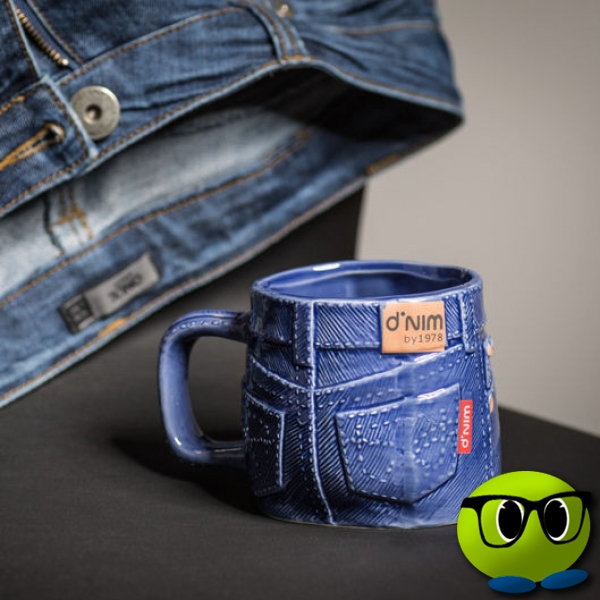 La tasse est conçue en céramique et se caractérise par sa forme en jeans avec l’étiquette de la marque Denim dessus.