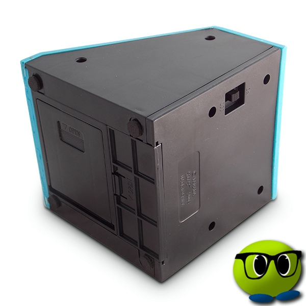 La tirelire est fabriquée en plastique et elle fonctionne grâce à deux piles AA.